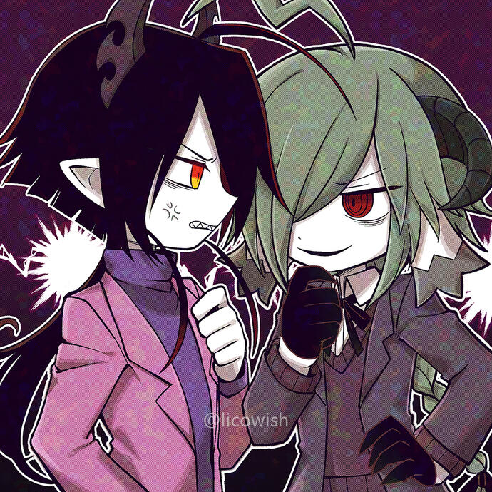 I was very lonely on Christmas of 2020 and my friend was introducing me to DSP's creations. We decided to RP them and they asked if I wanted to RP Licorice with Satanick or Envi. I was like, "I don't know these characters very well so either is fine" and they picked Envi.They're lovey dovey and married now with an angel child and it's pretty far from canon so I don't tweet about it very much. Occasionally you might see Marshmallow around.